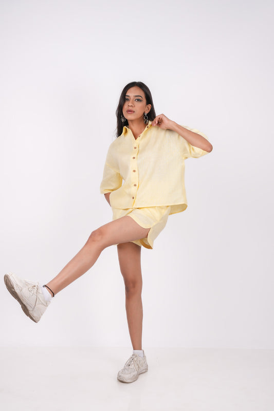 Sunshine Yellow Linen Co-Ord Set - Includes Pair of Shorts and Half Sleeves Drooping Shoulder Shirt