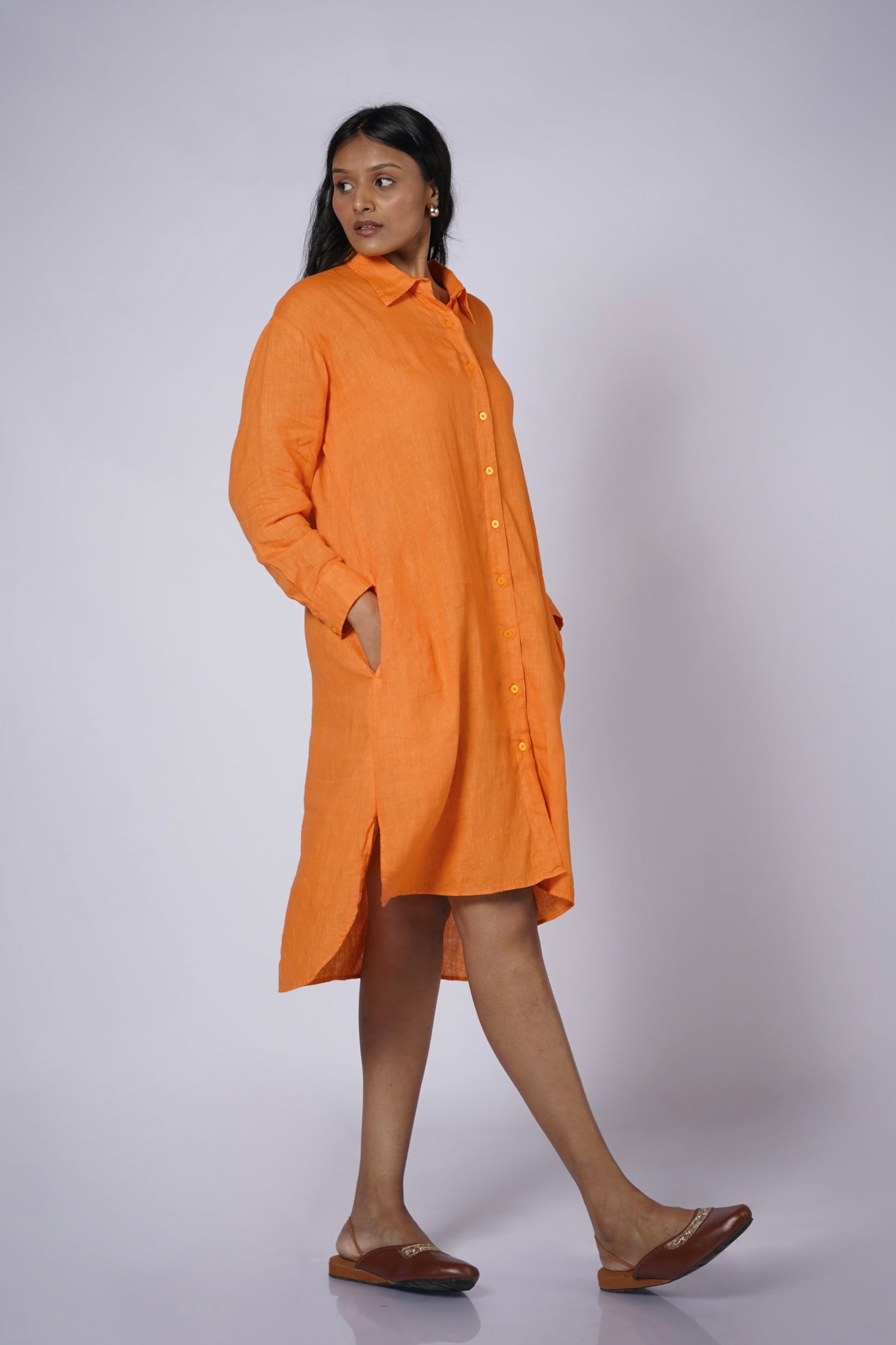 Is it a dress? Is it a tunic? Well, it’s whatever you want it to be! The Angarika Linen Shirt Dress in fiery bright orange is your go-to for every mood and moment. Work, brunch, play, or lounge—it moves with you effortlessly. Button it up as a dress, layer it over a slip, pair it with pants, or add a belt to define your waist—or don’t. Made from breathable linen, Angarika brings warmth, vibrance, and versatile style to every occasion.