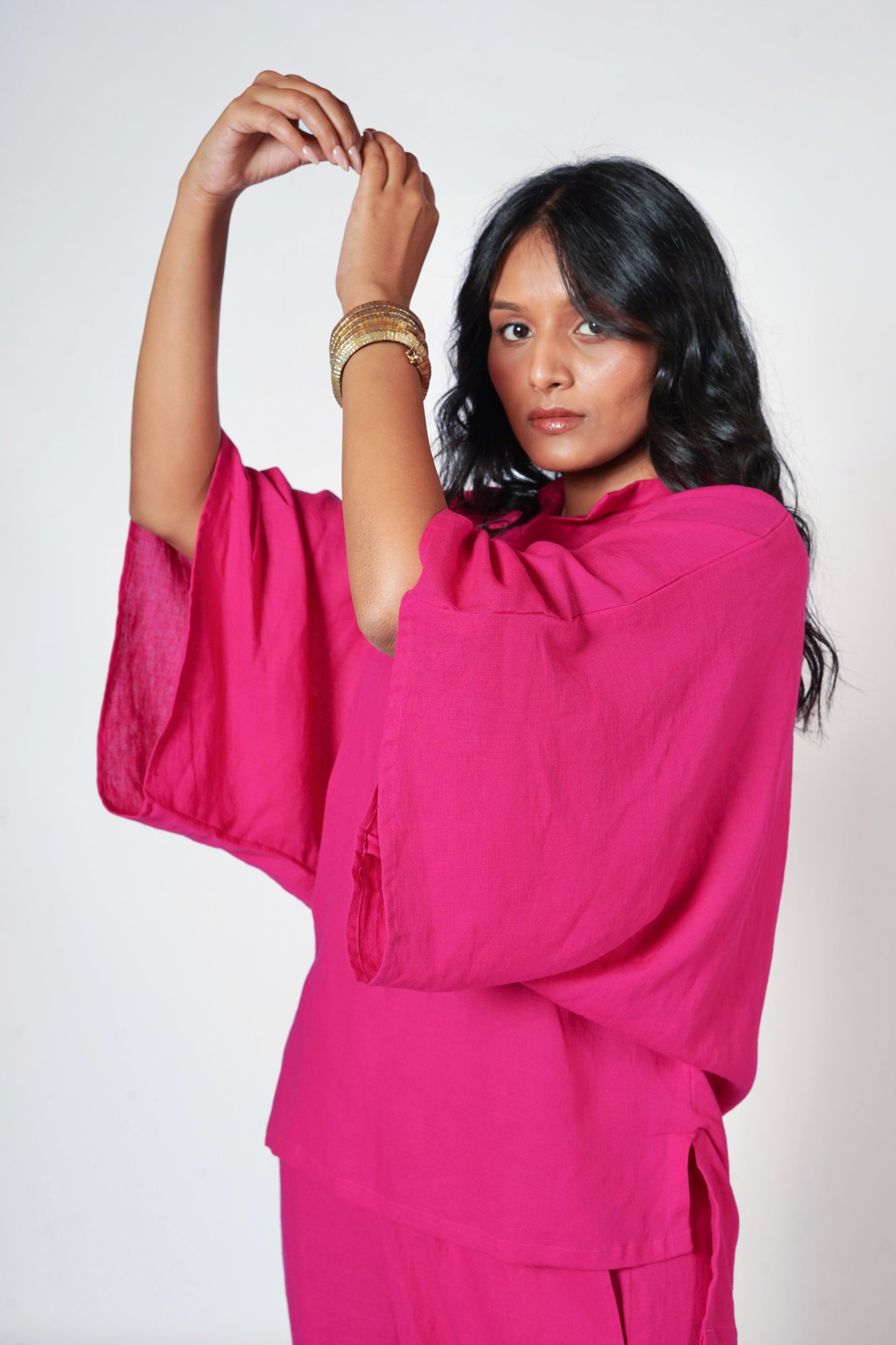 This vibrant and chic two-piece set is crafted from 100% pure, breathable linen in a bold, striking Fuchsia Pink colour.