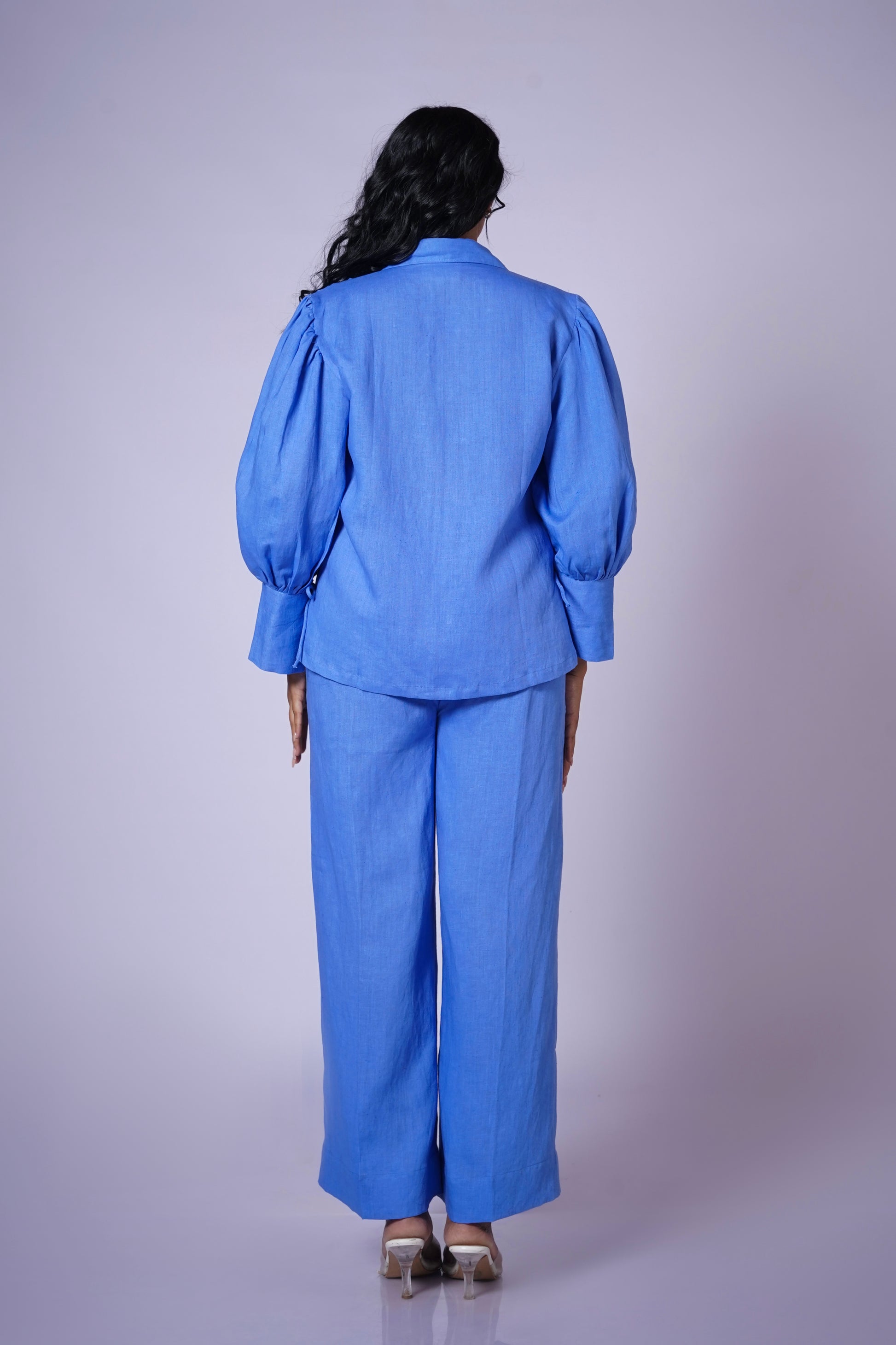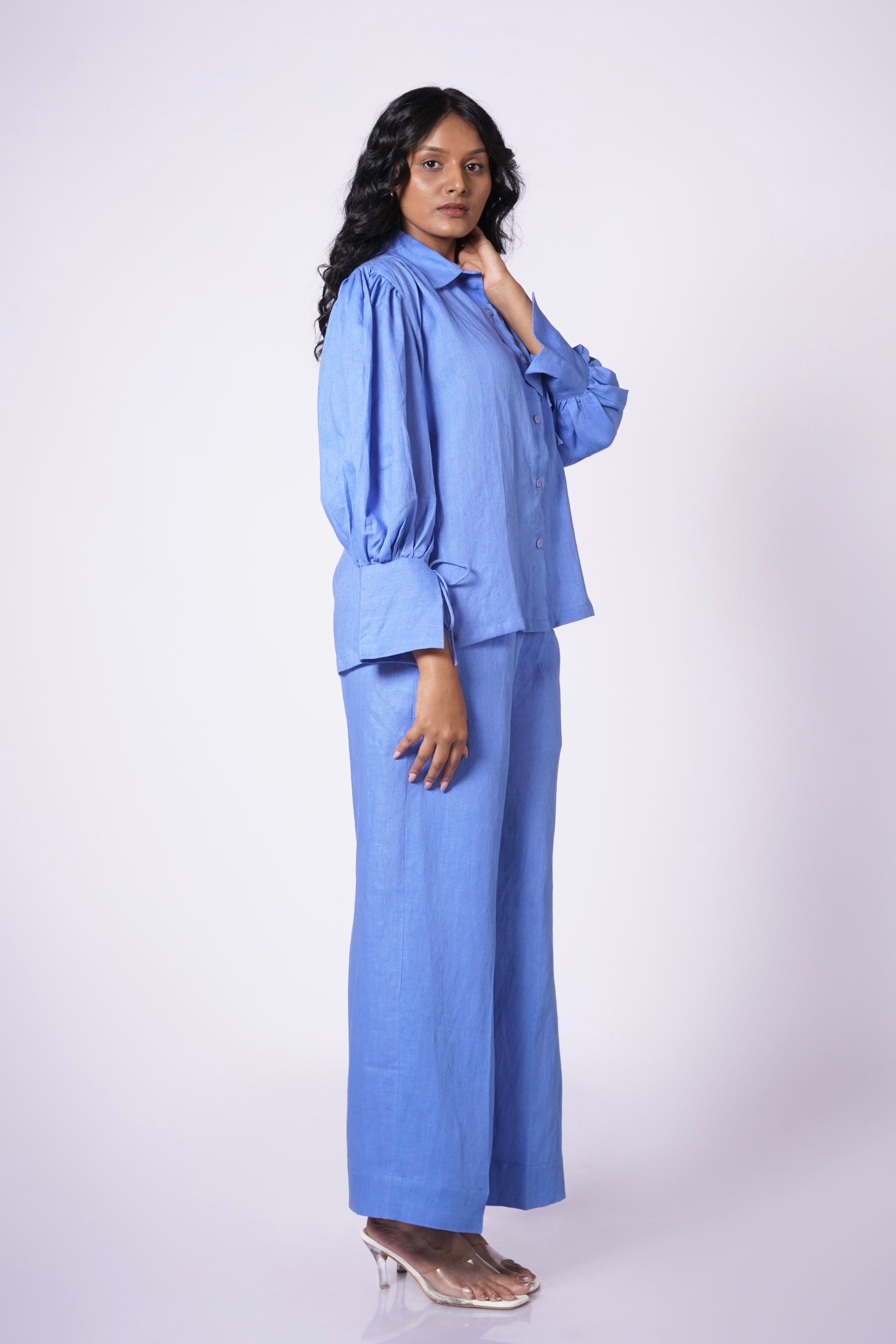 It is paired with matching wide-leg trousers, providing a comfortable and fluid silhouette that complements the volume of the shirt. This Jalneel set is a vibrant and fashion-forward choice, perfectly blending the natural ease of linen with a contemporary, voluminous design, ideal for a chic daytime look.