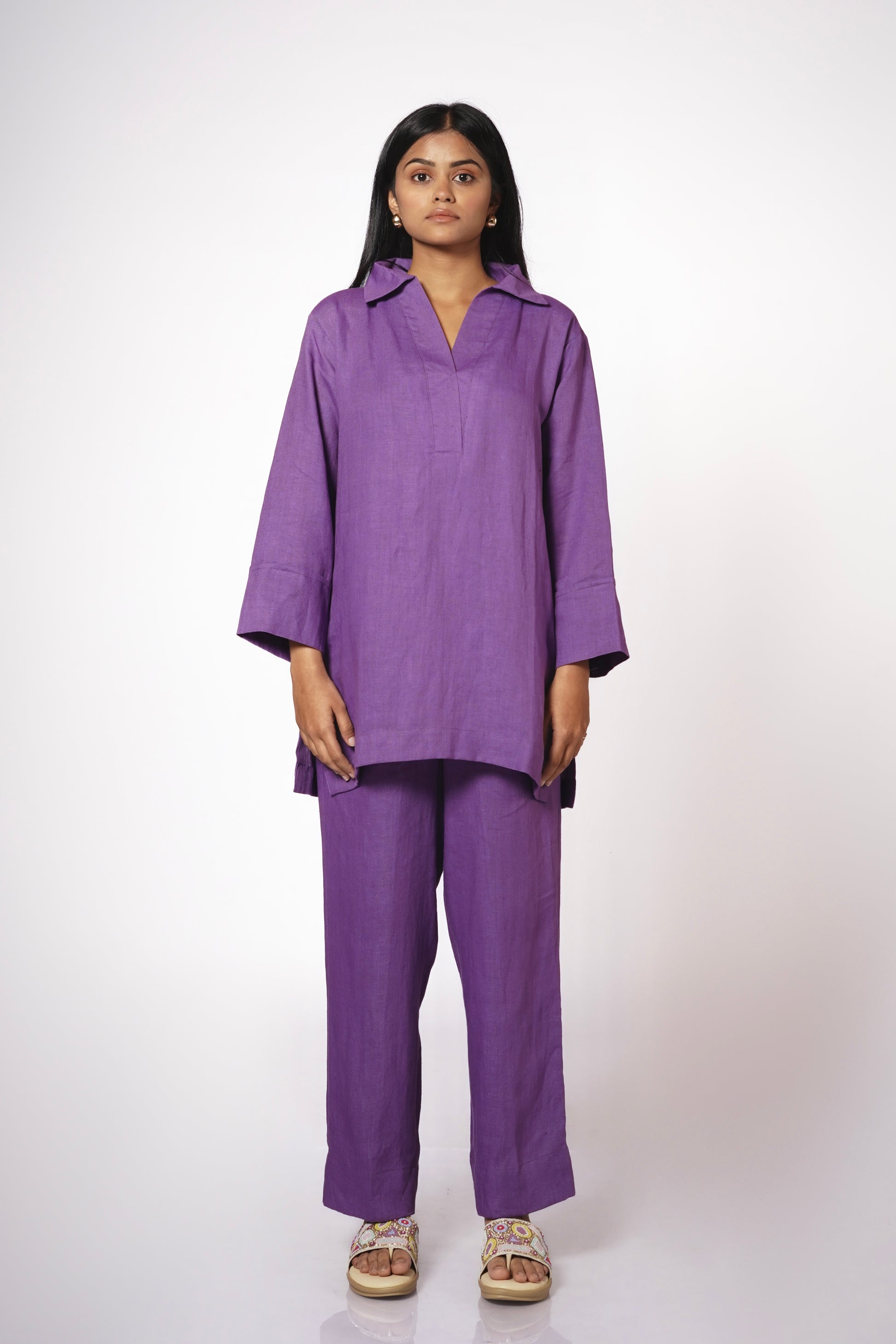 The kurta features a refined collar with a V-neck placket, falling effortlessly into a relaxed silhouette with three-quarter sleeves for timeless elegance. Its elongated cut enhances the natural drape of linen, creating a graceful, flowing form.