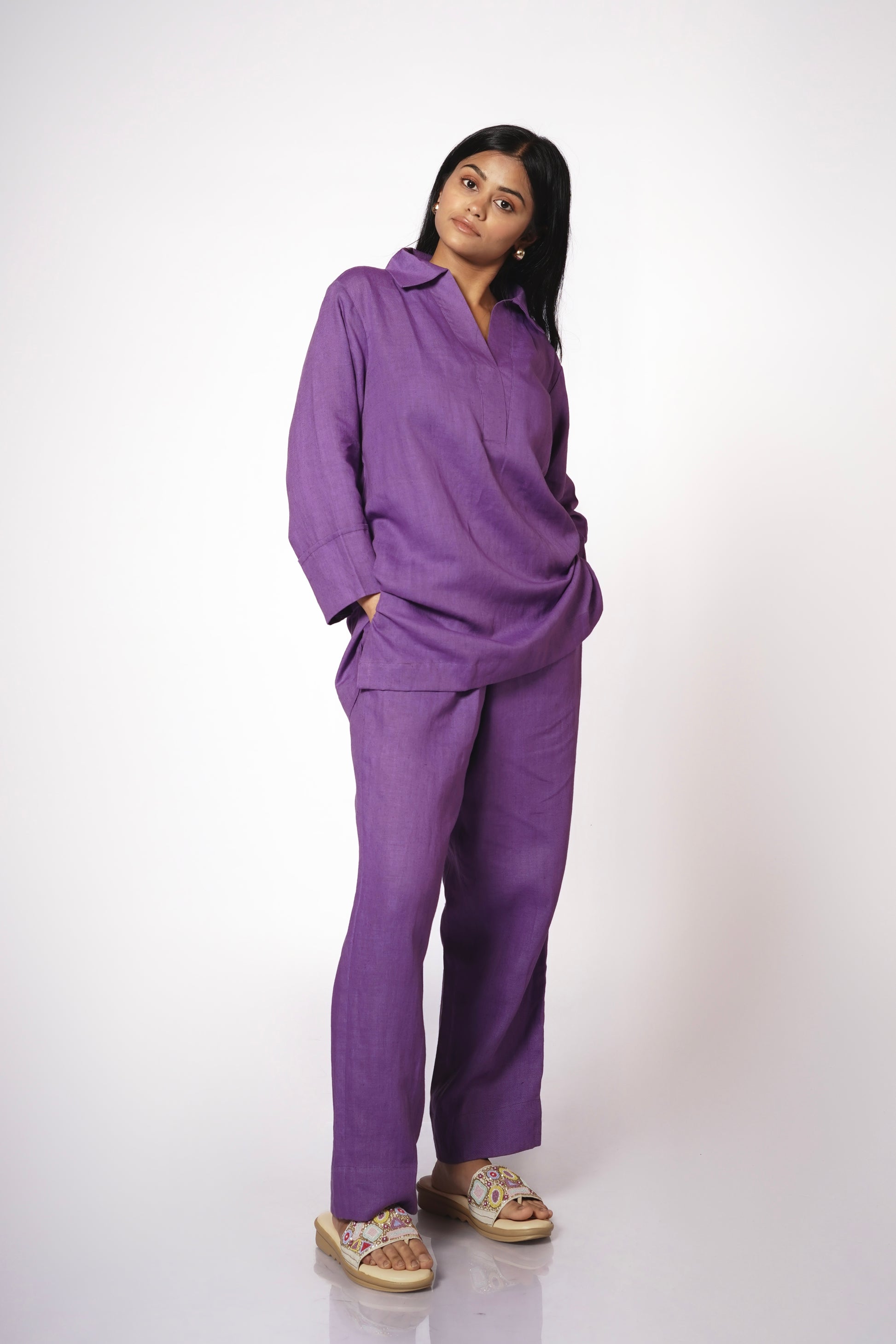 Crafted from the finest pure linen, the Jamuni Kurta Set embodies understated luxury in a deep, regal shade of jamuni (amethyst purple).