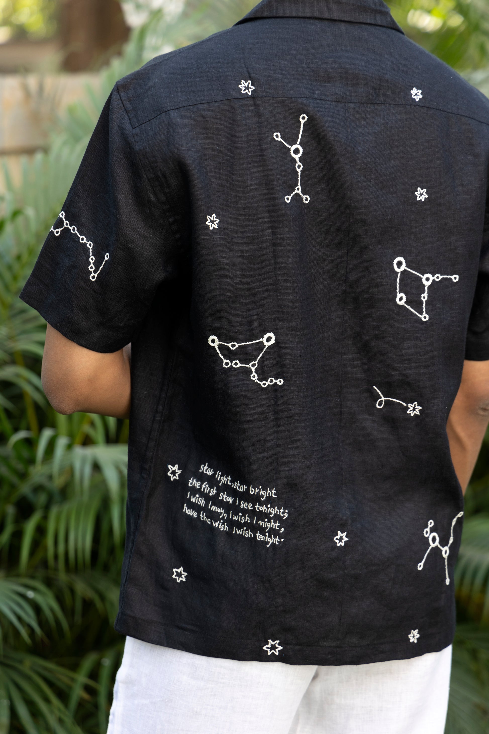 Manifest your dreams in style with the Make A Wish shirt. Crafted from pure linen, this black Cuban-collar shirt is embroidered with constellations, stars, and shooting stars, reminding you to always reach for the cosmos. Featuring the whimsical quote:
