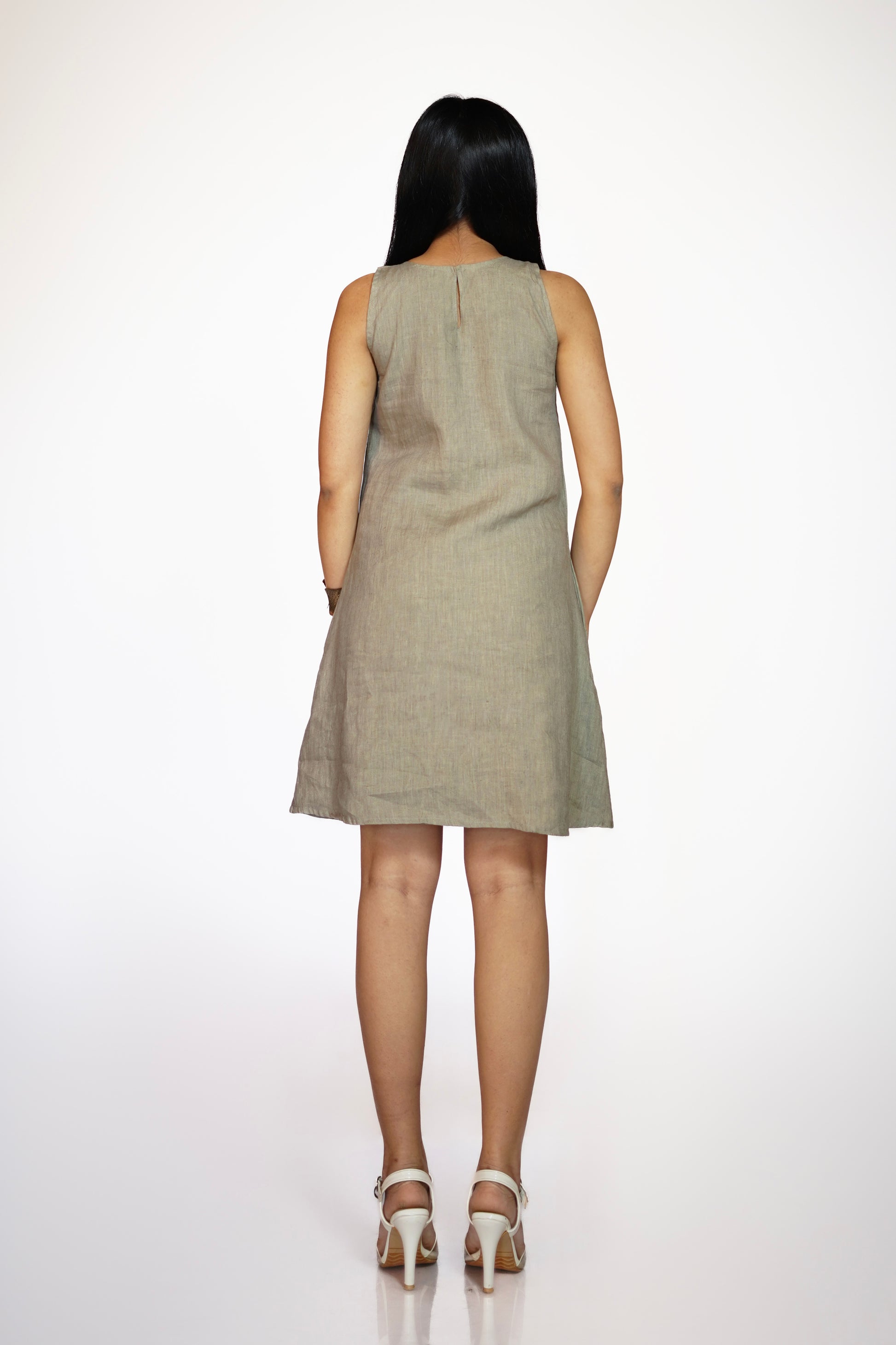 The Palash Shift Dress captures understated elegance in pure, premium linen, dyed in a subtle greyish green hue inspired by nature. Designed with a sleeveless A-line silhouette that ends just above the knee, it offers a relaxed fit and is fully lined for comfort and a smooth drape.