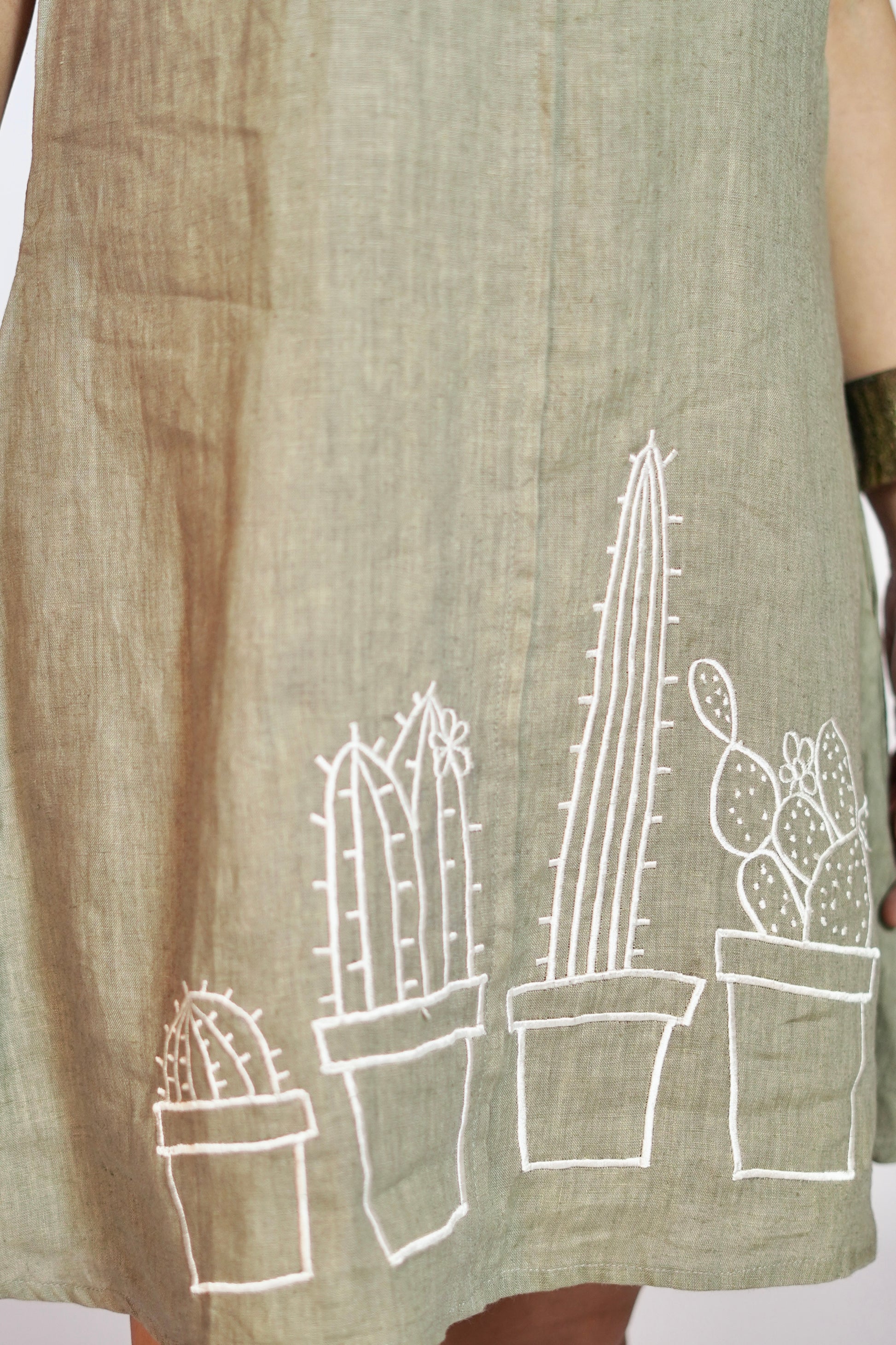 What makes Palash truly unique is its artisanal detail—hand embroidery along the hem featuring a playful row of potted white cacti and succulents. This modern motif adds a lighthearted charm to the timeless appeal of linen.