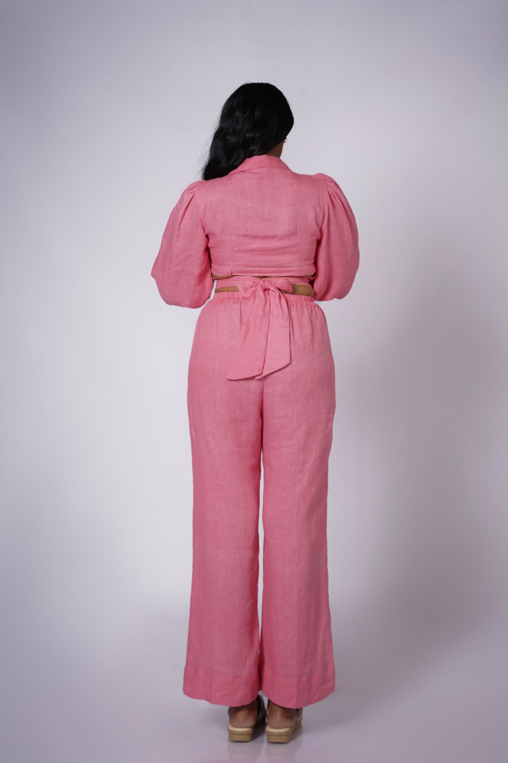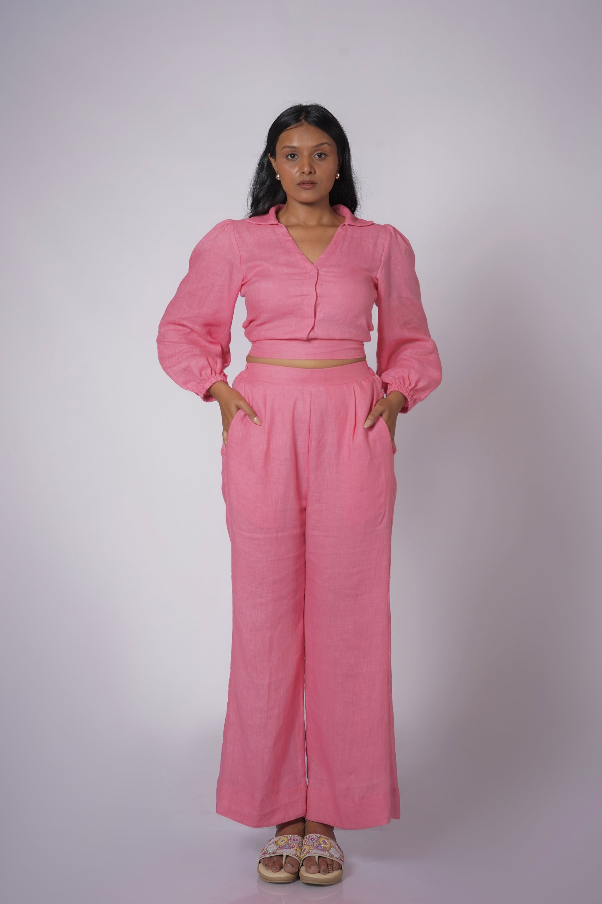 This vibrant and chic two-piece set is crafted from 100% pure, breathable linen in a delightful bright pink hue.