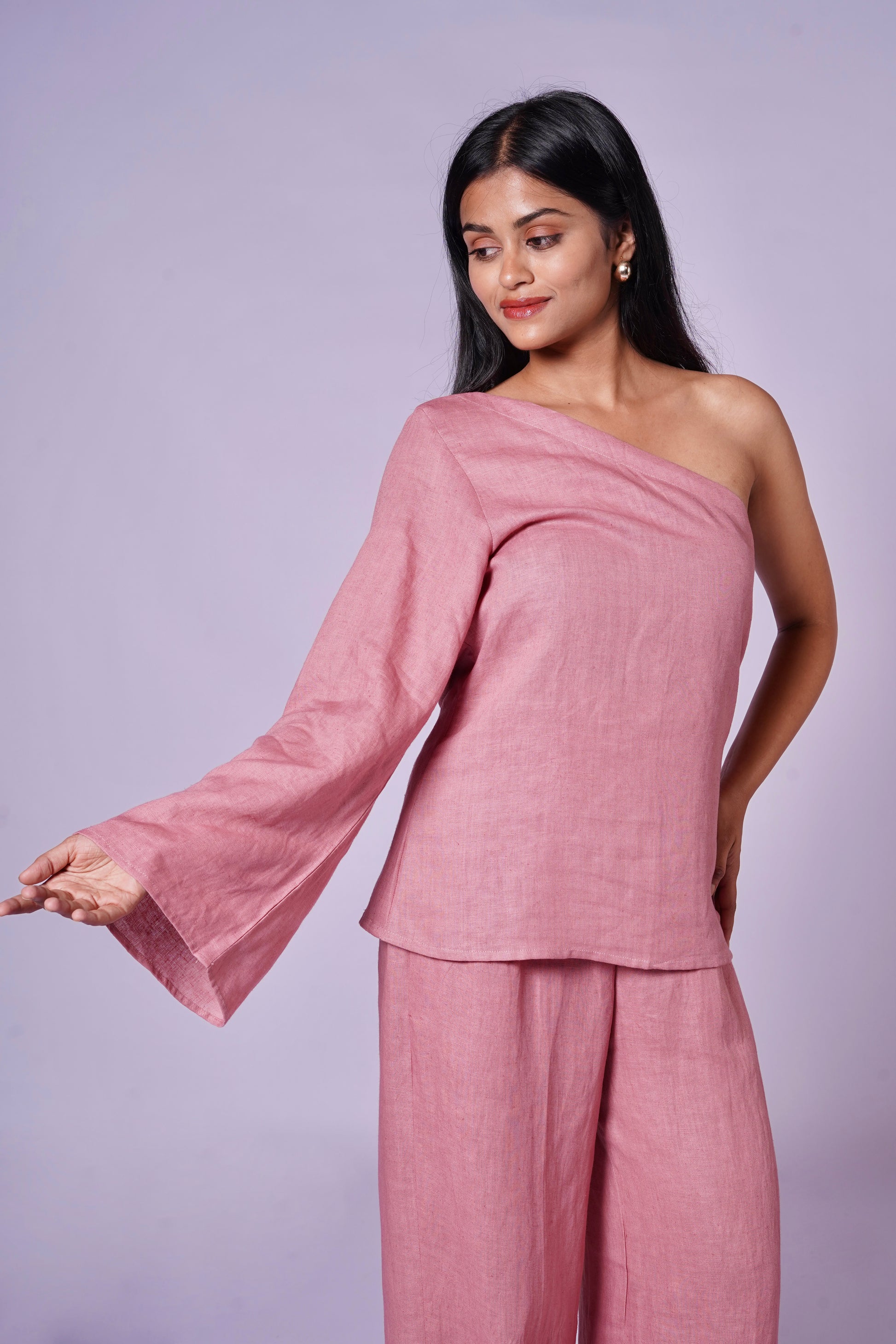 The set features a contemporary one-shoulder top with an asymmetrical neckline. It is designed with one dramatic long bell sleeve, balanced by a flattering sleeveless silhouette on the opposite side. The top has a relaxed, flowing fit and a gently curved hem.