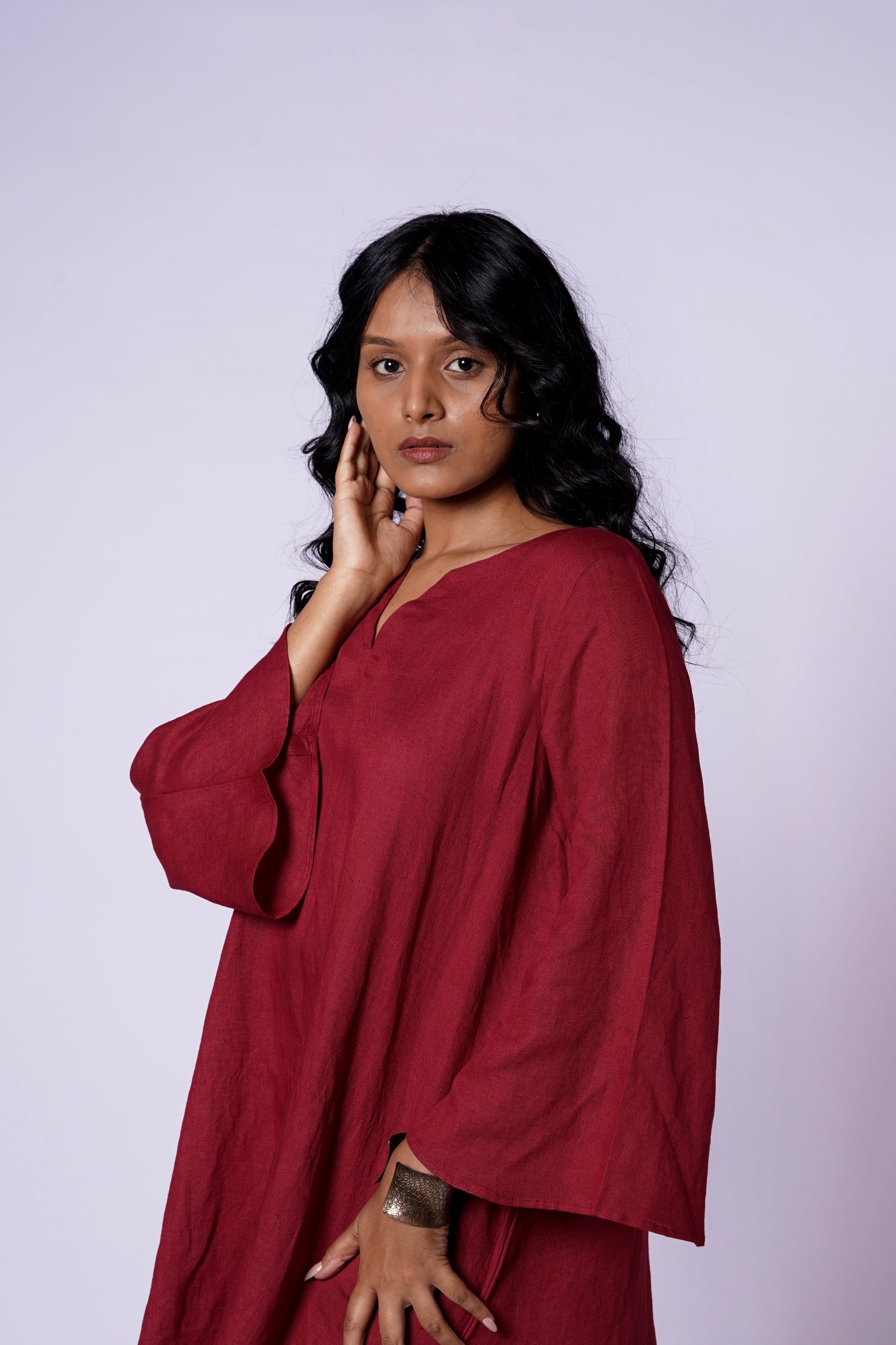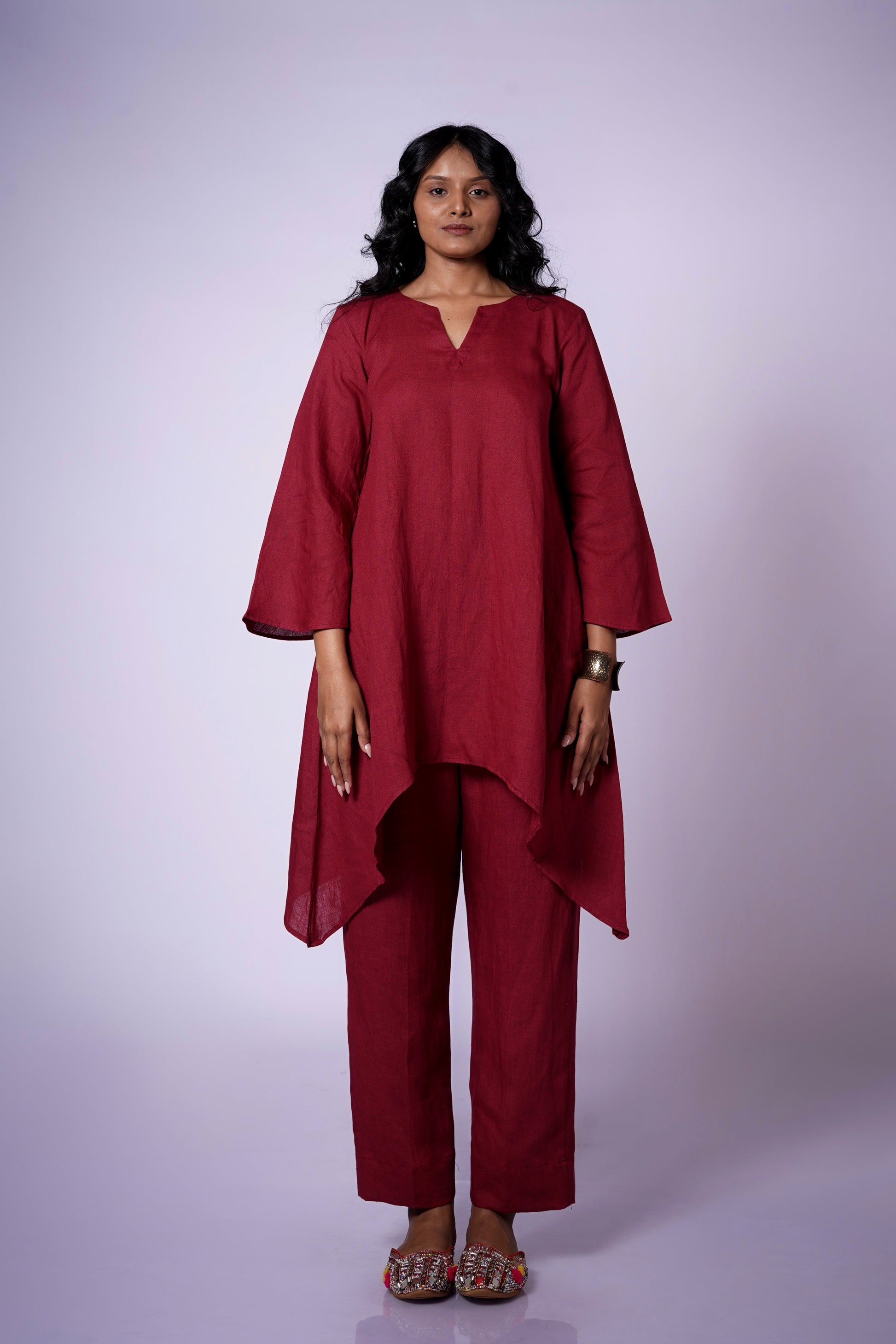Exuding elegance and sophistication, the Shahibind Assymetric Linen Kurta Set is meticulously crafted from 100% pure, breathable linen in a deep, opulent burgundy hue.