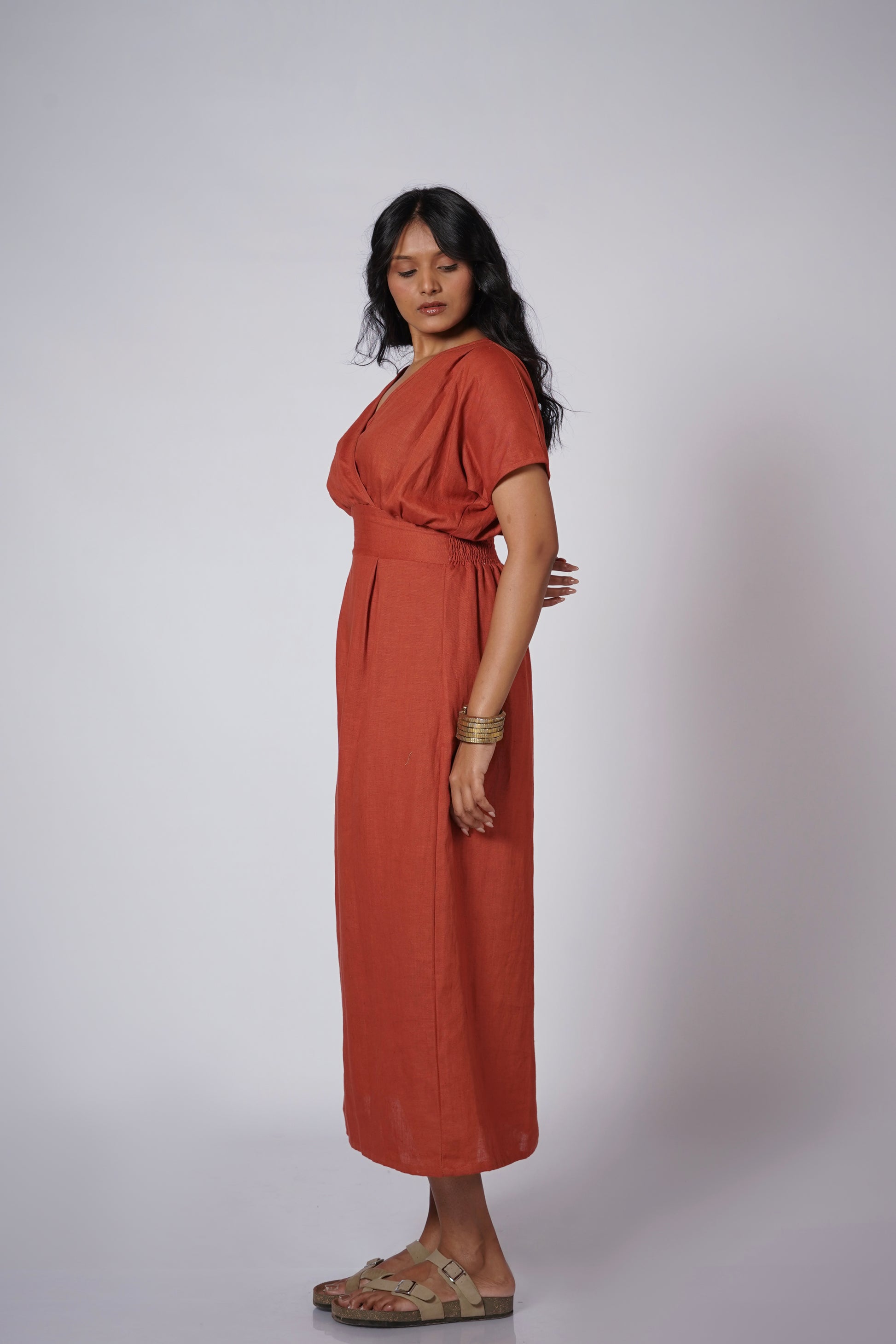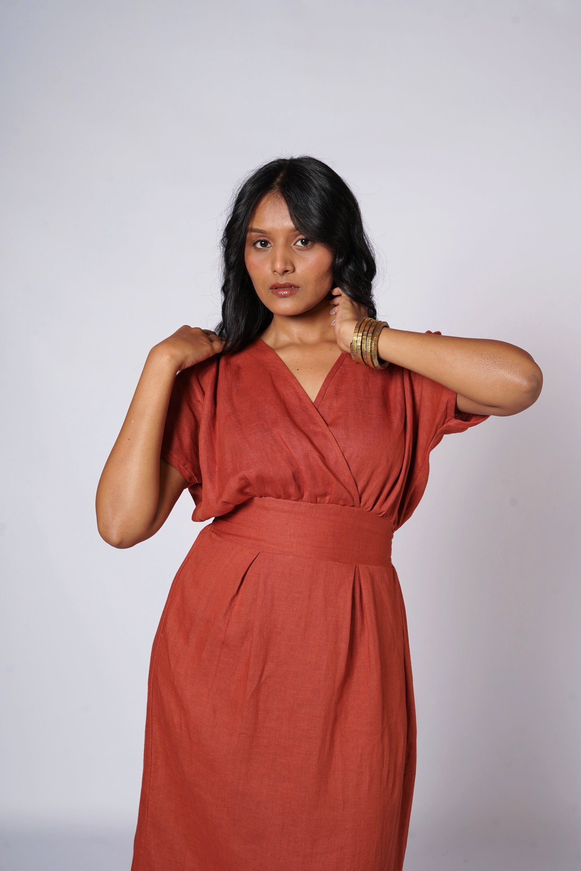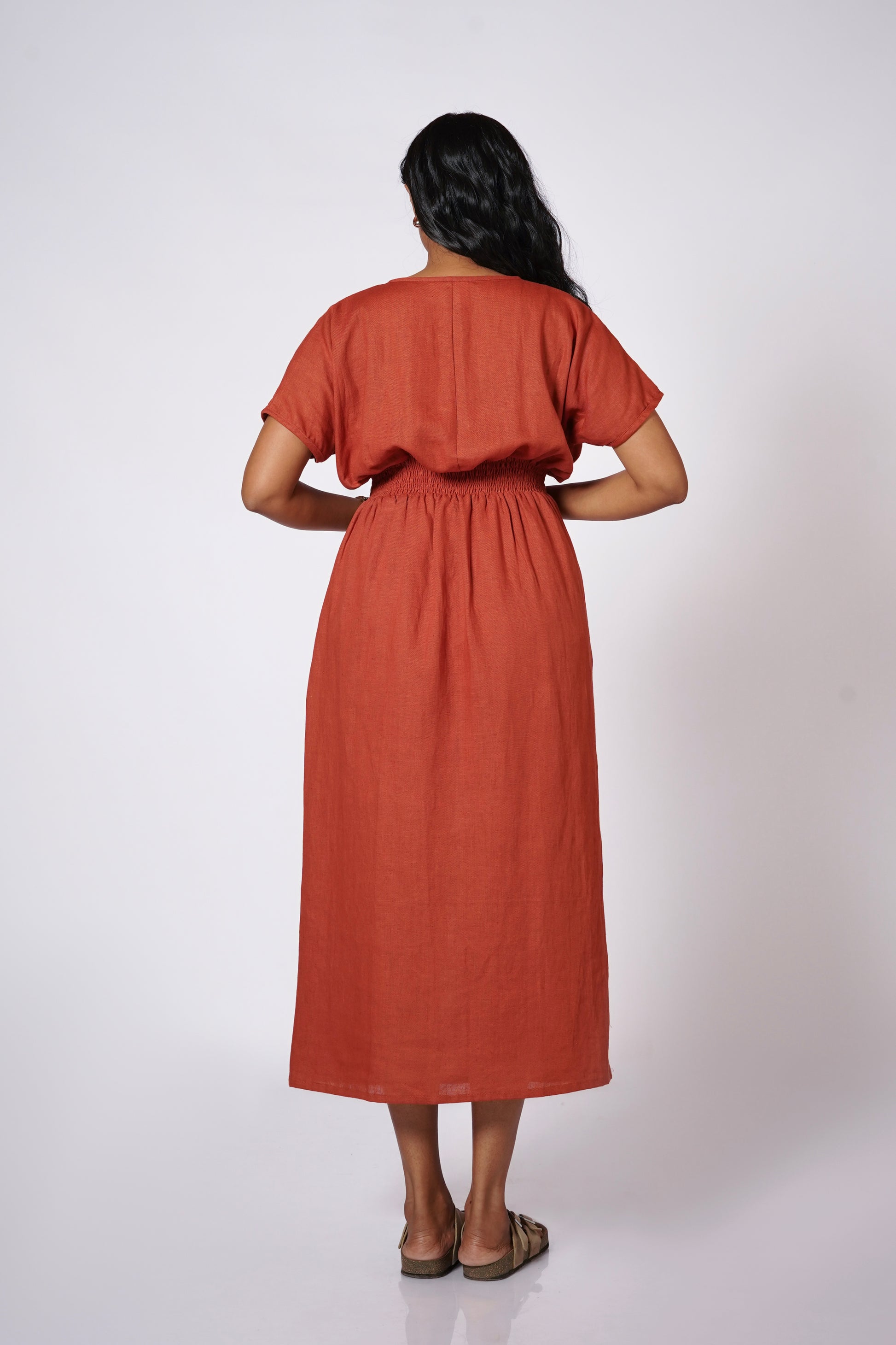 This elegant and versatile midi dress is crafted from 100% pure, breathable linen in a warm, inviting Terracotta colour—a rich, earthy shade.